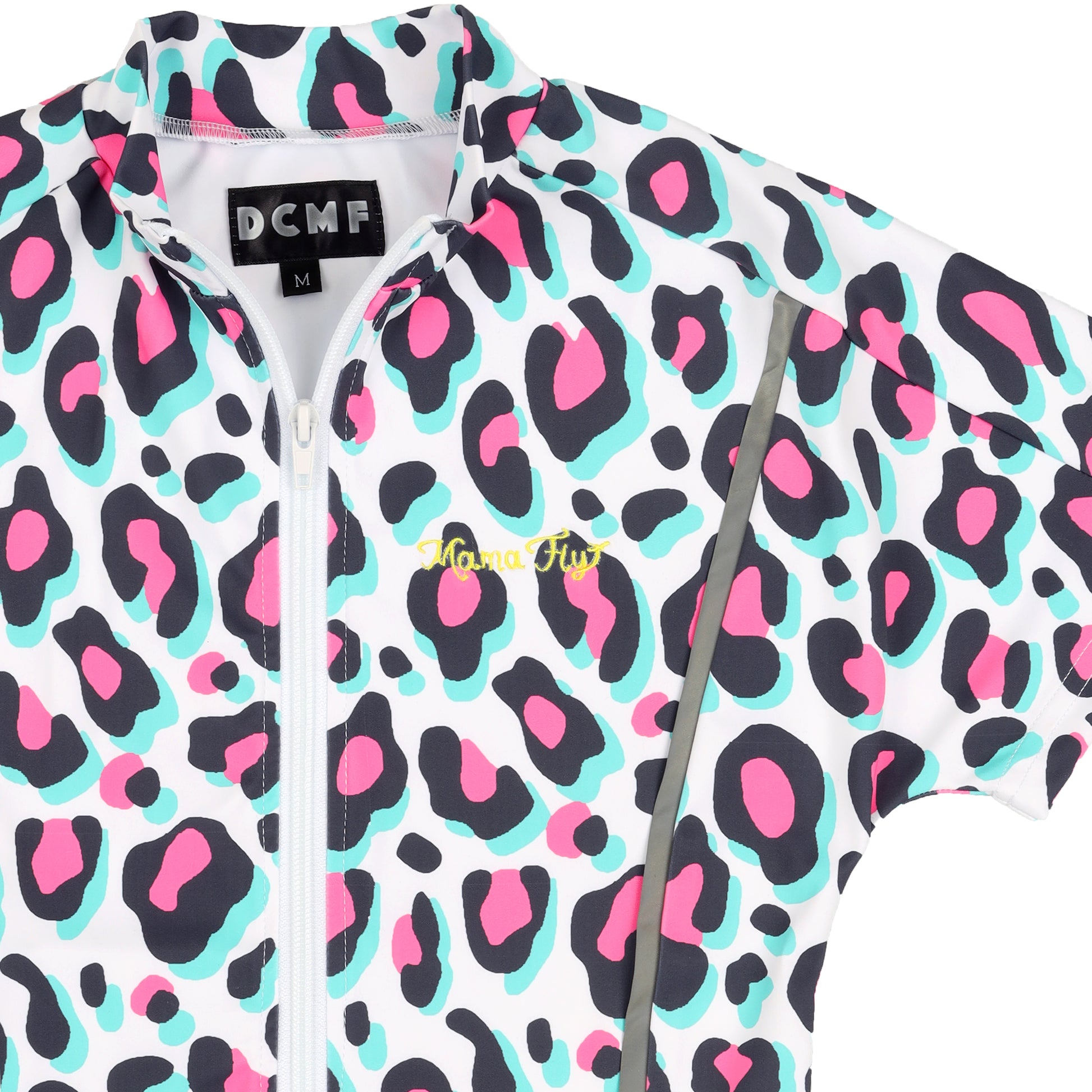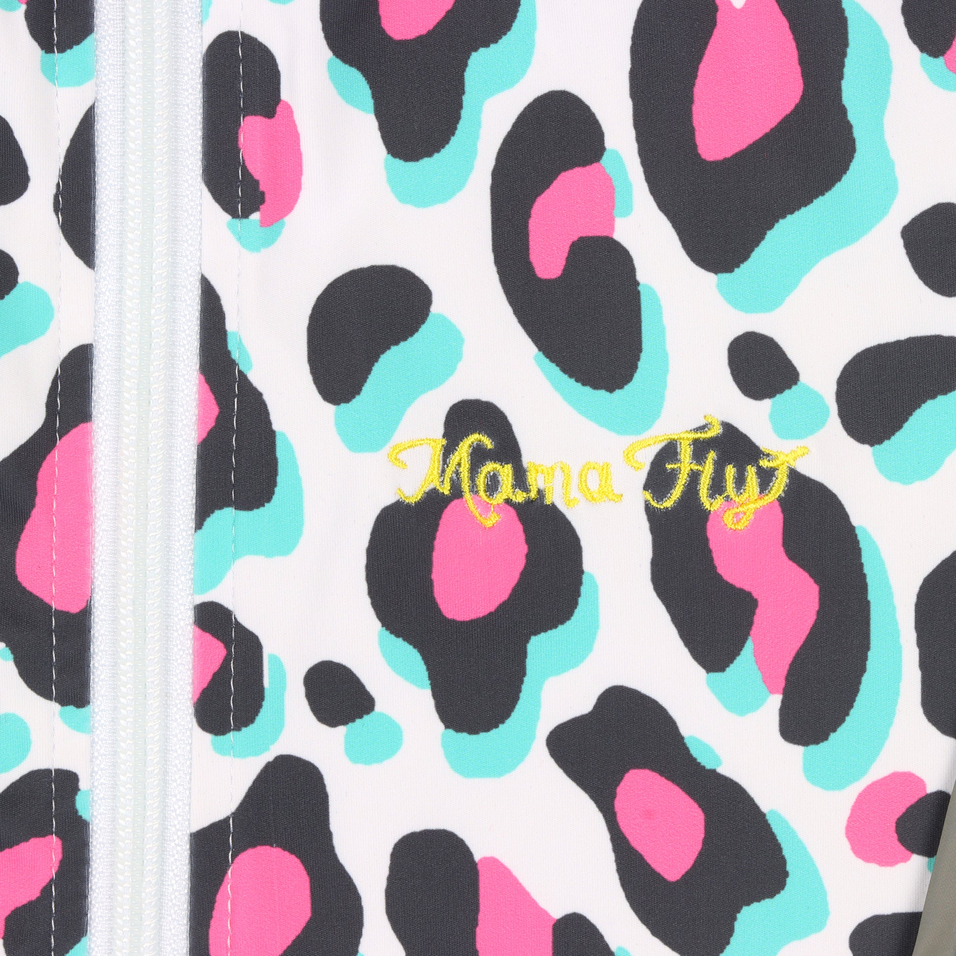 Get ready to turn heads with these vibrant cheetah shorts and zip-up bodysuit combo. The playful mix of pink, black and blue spots, with silver reflective strips running down the front, adds an extra dose of streetwear edge. Complete with a bold yellow logo, this outfit is designed to make you feel confident and empowered.